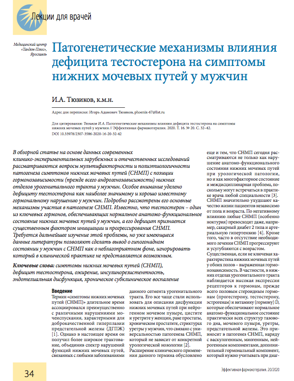Известно, что тестостерон – один из ключевых гормонов, обеспечивающих нормальное анатомо-функциональное состояние нижних мочевых путей у мужчин, а его дефицит признается существенным фактором инициации и прогрессирования СНМП. В обзорной статье на основе данных современных клинико-экспериментальных зарубежных и отечественных исследований рассматриваются вопросы мультифакторности и полиэтиологичности патогенеза симптомов нижних мочевых путей (СНМП) с позиции гормонозависимости (прежде всего андрогенозависимости) нижних отделов урогенитального тракта у мужчин. Особое внимание уделено дефициту тестостерона как наиболее значимому и хорошо известному гормональному нарушению у мужчин, подробно рассмотрены его основные механизмы участия в патогенезе СНМП.