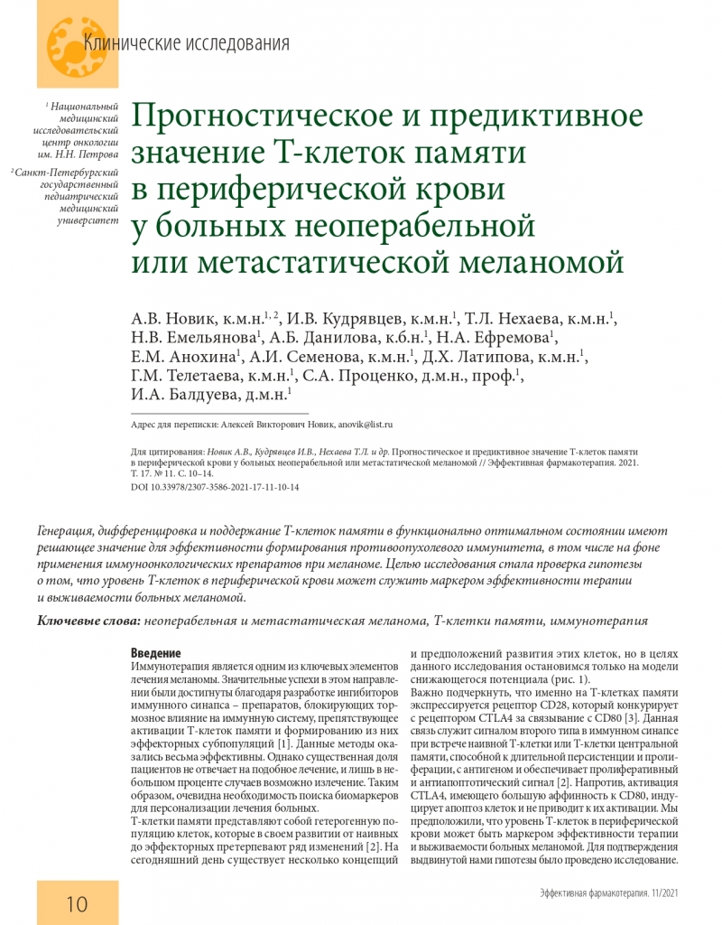 Эксперты из Национального медицинского исследовательского центра онкологии им. Н.Н. Петрова и Санкт-Петербургского государственного педиатрического медицинского университета рассказали о прогностическом и предиктивном значении Т-клеток памяти в периферической крови у больных неоперабельной или метастатической меланомой. Генерация, дифференцировка и поддержание Т-клеток памяти в функционально оптимальном состоянии имеют решающее значение для эффективности формирования противоопухолевого иммунитета, в том числе на фоне применения иммуноонкологических препаратов при меланоме. Целью исследования ученых стала проверка гипотезы о том, что уровень Т-клеток в периферической крови может служить маркером эффективности терапии и выживаемости больных меланомой.